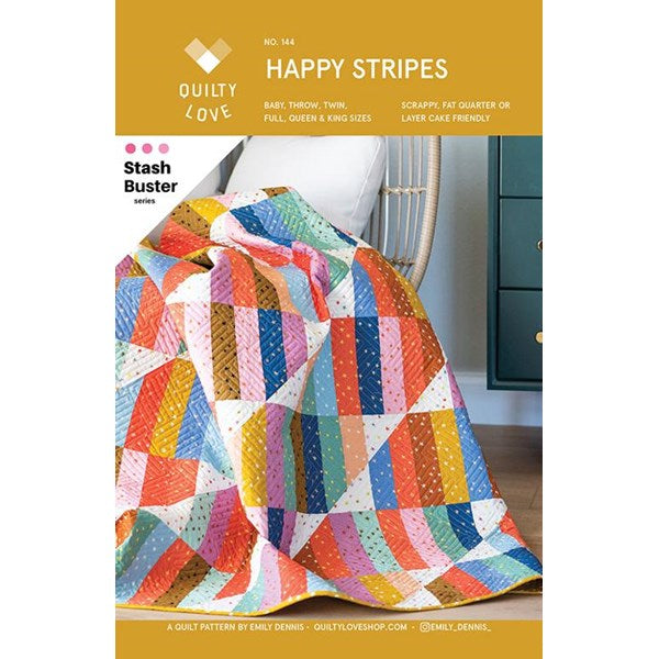 Happy Stripes is a stash buster quilt pattern! Use this quilt pattern to start sewing through your stash. Use fat quarters, layer cake squares, jelly roll strips or your scrap stash for this fast and fun strip pieced quilt pattern. Happy Stripes includes two bonus patterns! Use up the cut off half square triangles in a simple patchwork quilt or a sawtooth star quilt.