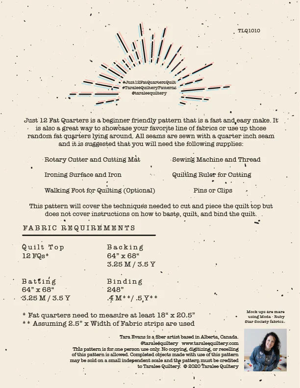 Just 12 Fat Quarters is a beginner friendly pattern that is a fast and easy make. It is also a great way to showcase your favorite line of fabrics or use up those random fat quarters lying around. See #just12fatquartersquilt on Instagram for inspiration. All seams are sewn with a quarter inch seam and it is suggested that you will need the following supplies: