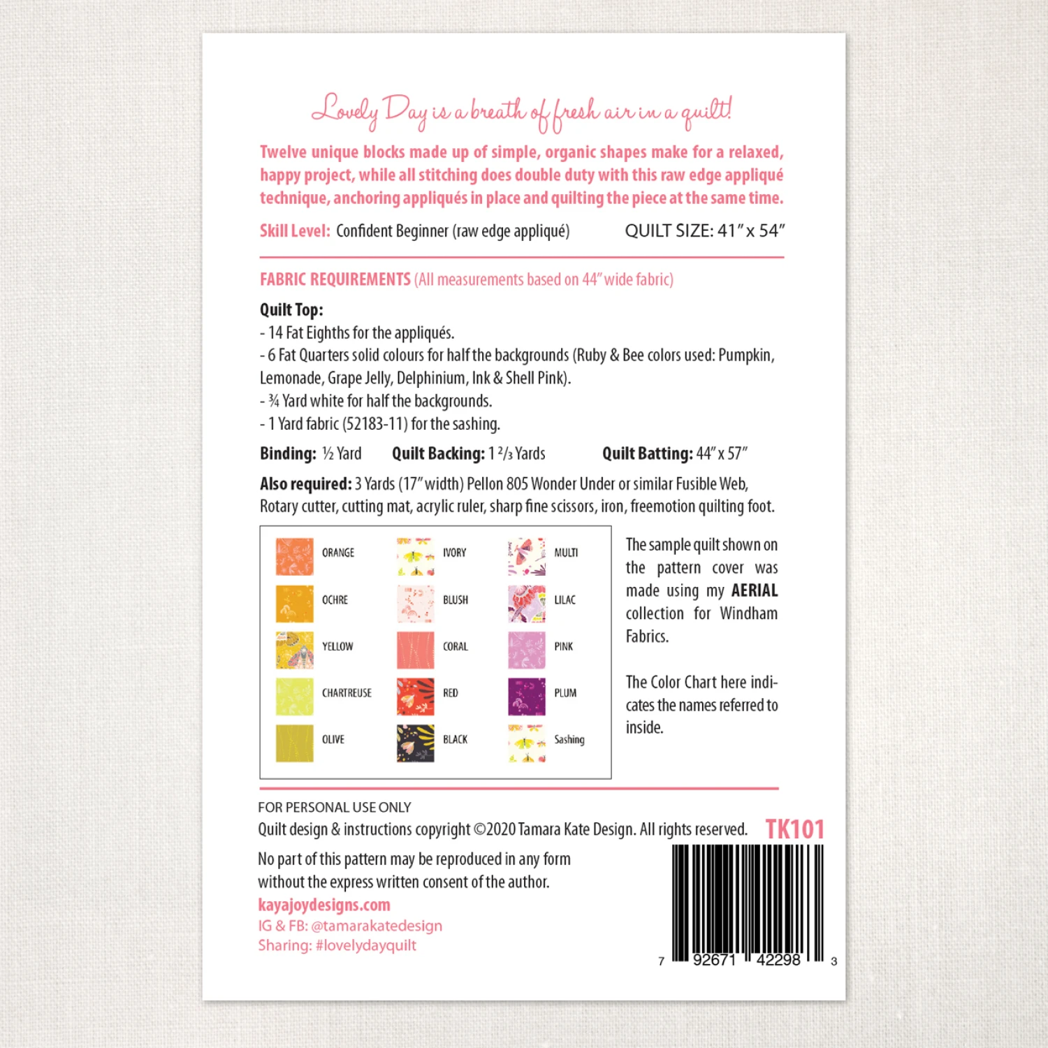 Lovely Day Appliqué Quilt Pattern (paper version). Finished Size: 41" x 54". Skill Level: Advanced Beginner (free motion quilting) Twelve unique blocks made up of simple, organic shapes make for a relaxed, happy project, while all stitching does double duty with this raw edge appliqué technique, anchoring appliqués in place and quilting the piece at the same time. Includes: Full sized templates, instructions, diagrams, layout diagram for easy template placement, fabric requirement list.