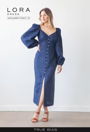 The Lora pattern is an empire waist dress with four views. All views have underbust gathers, a self-lined bodice, and twelve loop buttons along the center front. Views A and C have half-inch spaghetti straps at the shoulders while Views B and D have long puff sleeves. The dress is fittted through the waist and hips and has a straight fit through the skirt with Views A and B ending just above the knee and Views C and D hemmed a couple inches above the ankle.